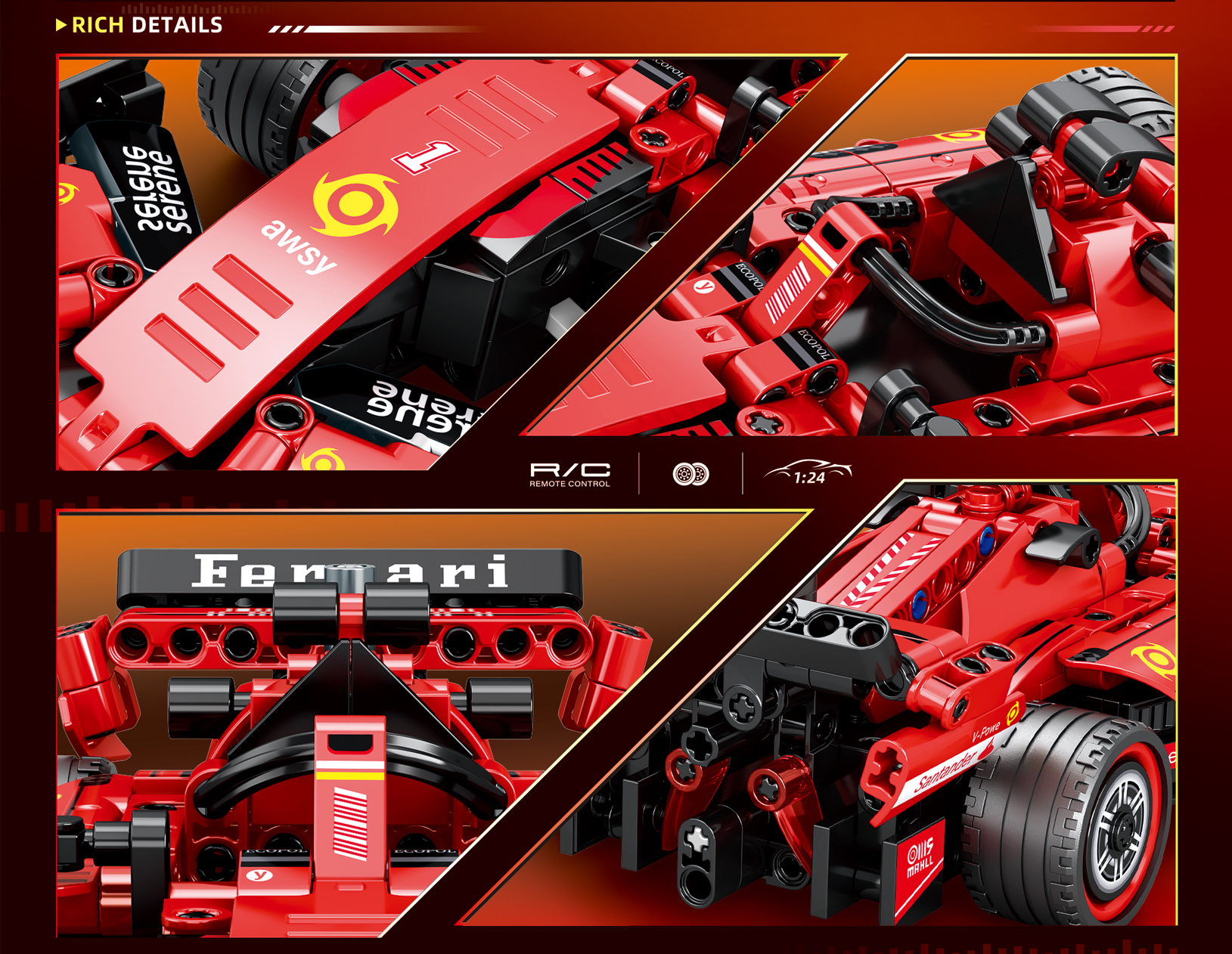 - REMOTE CONTROL BUILDING SET: This 315-piece building block set lets you construct a detailed 1:24 scale F1 racing car replica with 2.4 GHz remote control functionality for an immersive racing experience